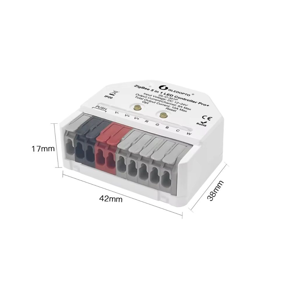 Gledopto GL-C-301P Ultra Mini RGB+CCT LED-vezérlő az egyik legkisebb okos LED vezérlő a piacon, amely támogatja a Zigbee 3.0 protokollt és az RF 2,4 GHz-es helyi távirányítást is. Az 5 az 1-ben vezérlő különféle típusú 12V vagy 24V LED-szalagokat támogat: RGBCCT / RGBW / RGB / CCT (meleg és hideg fehér) / egyszínű LED-szalagok. Apró méretének köszönhetően akár fali aljzatba is szerelhető.