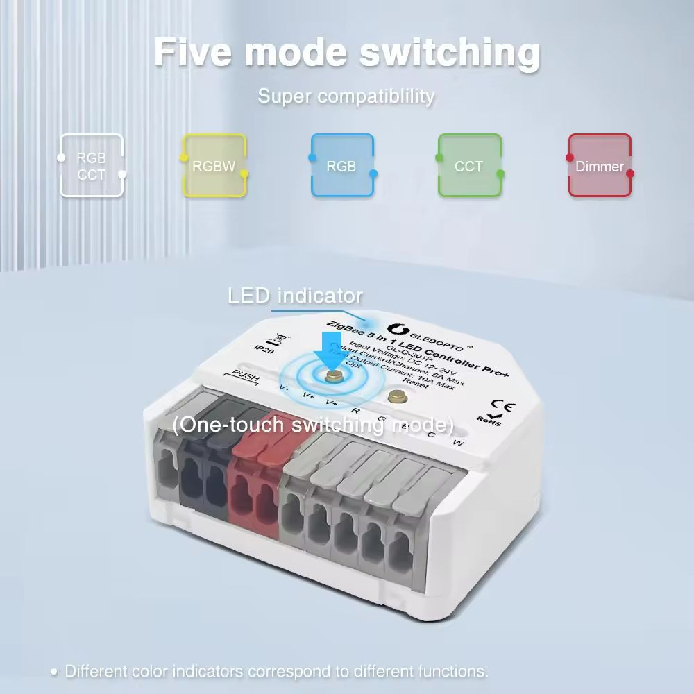 A Gledopto GL-C-301P Ultra Mini RGB+CCT LED-vezérlő az egyik legkisebb okos LED vezérlő a piacon. Fejlett Zigbee 3.0 protokolljának köszönhetően ez a vezérlő zökkenőmentesen integrálható a népszerű okosotthon rendszerekkel, lehetővé téve a felhasználók számára, hogy az RGB+CCT (színes + fehér színhőmérséklet állítással) LED-szalagokat precízen és könnyedén irányítsák.