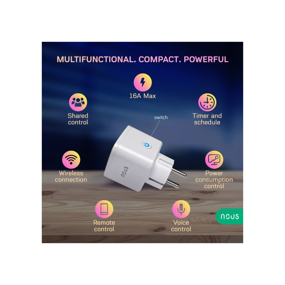 • Könnyű telepítés: Egyszerűen csatlakoztatható bármely szabványos konnektorba, és könnyen kezelhető a Nous Smart vagy Tuya Smart Life alkalmazásokkal.