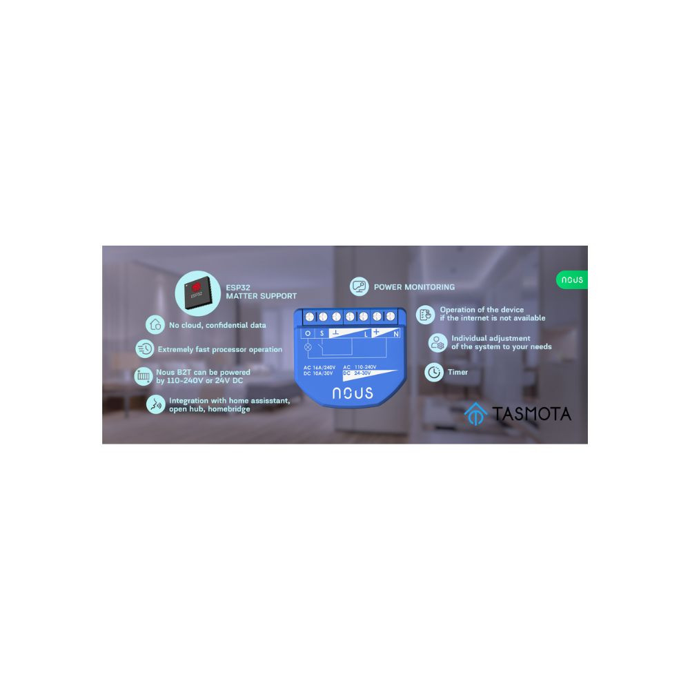 A Nous B2T WiFi okos kapcsolómodul egy csatornás relé kapcsolóként, és fogyasztásmérőként is használható. Az eszköz beépített ESP32 MINI-1 modullal és 4MB flash memóriával rendelkezik, és előtelepített Tasmota firmware-rel érkezik, amely lehetővé teszi a könnyű integrációt különféle okosotthon rendszerekkel, például a Home Assistanttal.