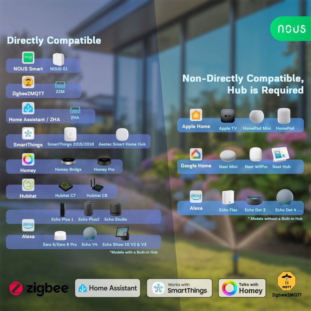 A Nous L14 öntözőszelep a Tuya Zigbee protokollt használja, ami stabil és megbízható kommunikációt biztosít. A telepítés egyszerű, és a vezérléshez mindössze egy kompatibilis Tuya / SmartLife Zigbee átjáróra van szükség, de a készülék kompatibilis a Home Assistant Zigbee koordinátorokkal és a felhős Amazon Alexa és a Google Assistant hangvezérlőkkel is, így hangutasításokkal is irányítható.