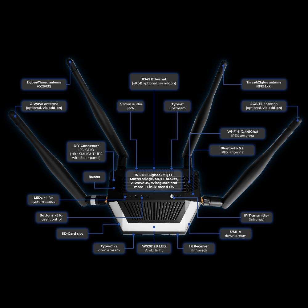 SMLIGHT SMHUB Premium  –  Multi-Radio Smart Home Hub, Zigbee, Thread, Wi-Fi, Bluetooth, Z-Wave, 4G/LTE, IR, Ethernet, Matter átjáró, fekete, (P10+MG24)