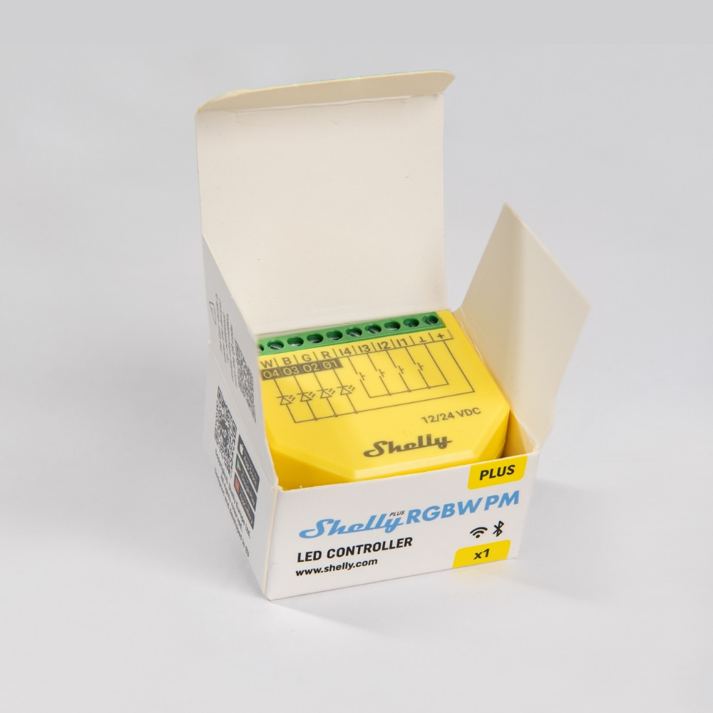 A Shelly Plus RGBW PM a népszerű Shelly RGBW2 új verziója, az egyik legkisebb méretű, kapcsoló fali aljzatába vagy szerelődobozba is beszerelhető Wi-Fi + Bluetooth okosvezérlés RGBW (színes és fehér) LED szalagok/csíkok vezérlésére. Bluetooth vevőegységgel is fel van szerelve, távirányítható a Shelly BT táviránytóiról és fali kapcsolóiról is.