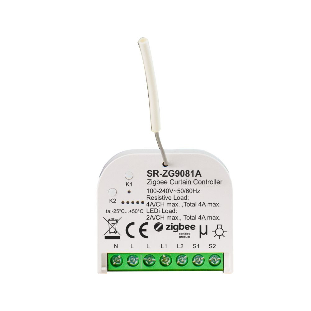 Az SR‑ZG9081A egy kompakt, falba szerelhető vezérlőegység, amely zökkenőmentesen integrálható Zigbee 3.0 mesh hálózatba. Különféle redőnytípusok – például roló, reluxa, függöny – vezérlésére alkalmas, két kapcsoló bemenettel rendelkezik, melyek tetszőlegesen konfigurálhatók a kapcsolótípustól függően. A vezérlés kompatibilis Zigbee okosotthon központokon keresztül történik. Kis méretének és IP20 védettségének köszönhetően könnyen telepíthető szabvány fali dobozba.