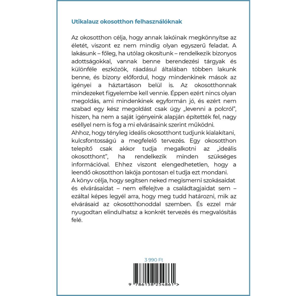 A könyv célja, hogy - mint egy munkafüzet - segítsen neked megismerni szokásaidat és elvárásaidat – nem elfelejtve a családtagjaidat sem – ezáltal képes legyél arra, hogy meg tudd határozni, mik az elvárásaid az okosotthonoddal szemben. És ezzel már nyugodtan elindulhatsz a konkrét tervezés és megvalósítás felé.